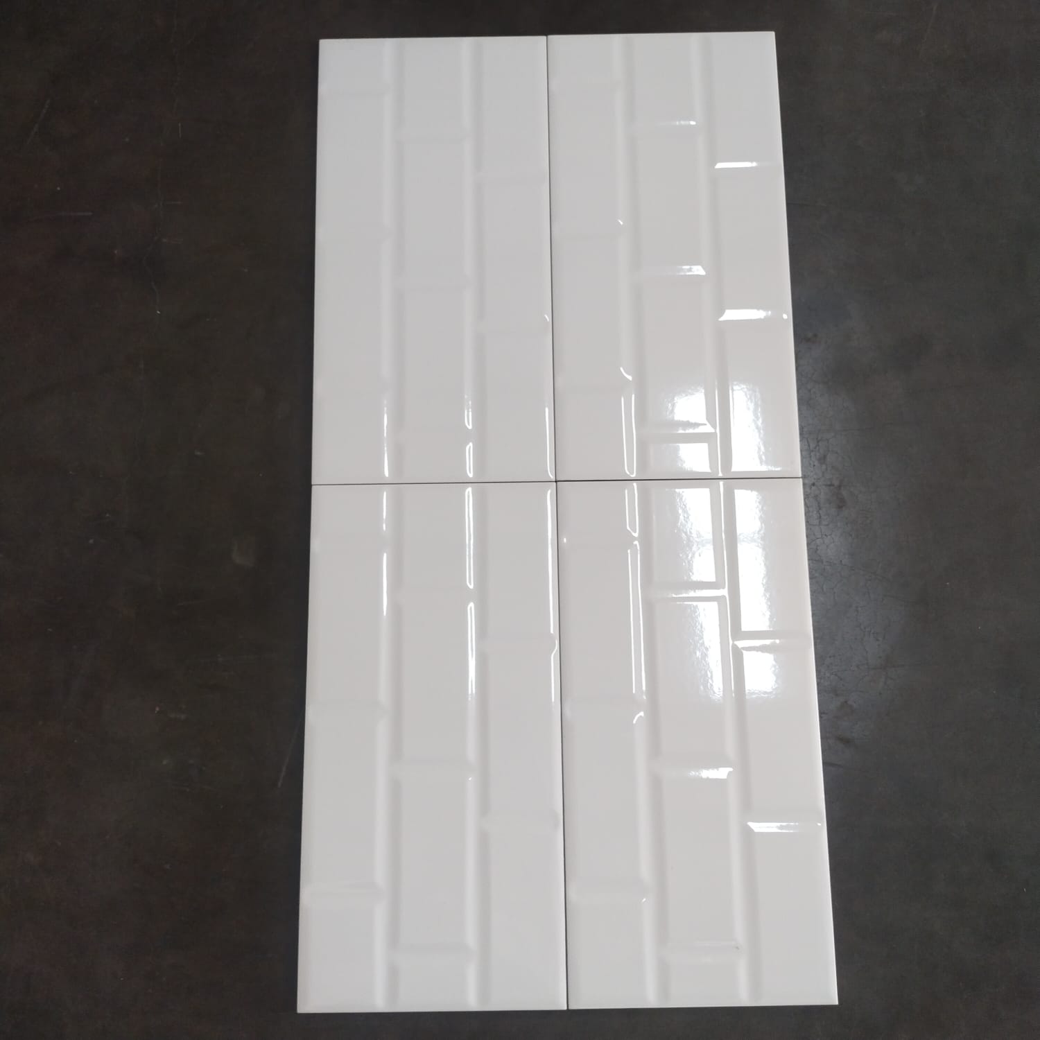 Keramik dinding ukuran 25×50 mempunyai permukaan embossed dengan finishing glossy yang bermotif batu bata putih.