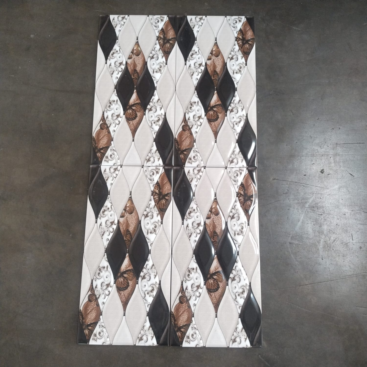 Keramik dinding ukuran 25×50 mempunyai permukaan embossed dengan finishing glossy yang bermotif.