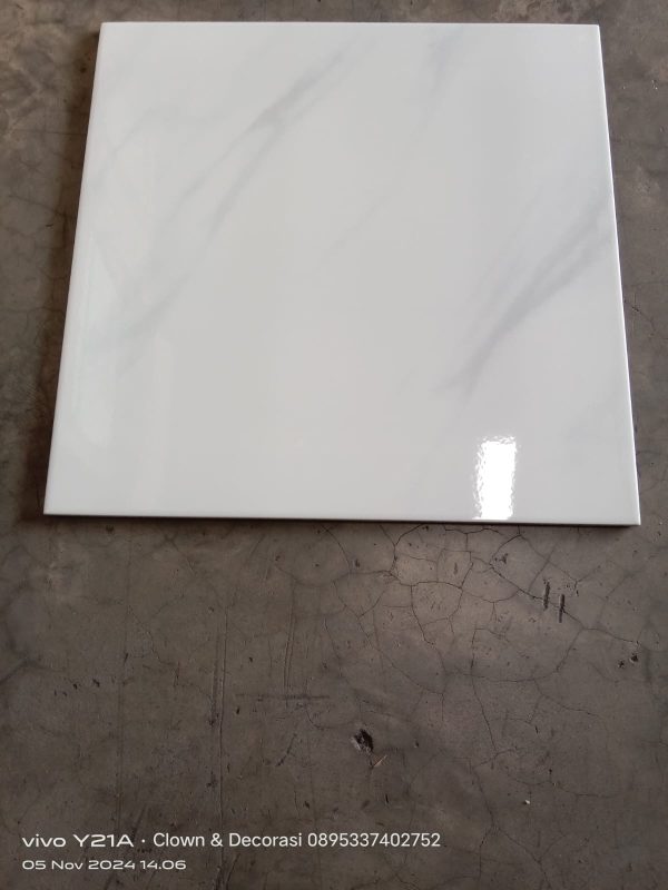 Keramik lantai ukuran 50×50 mempunyai permukaan flat dengan finishing glossy yang bermotif marble.