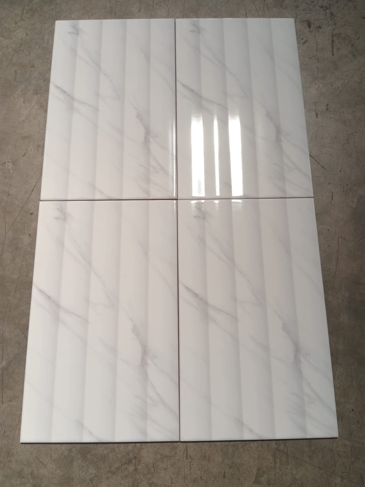 Keramik dinding ukuran 25×40 mempunyai permukaan embossed dengan finishing glossy yang bermotif marble.